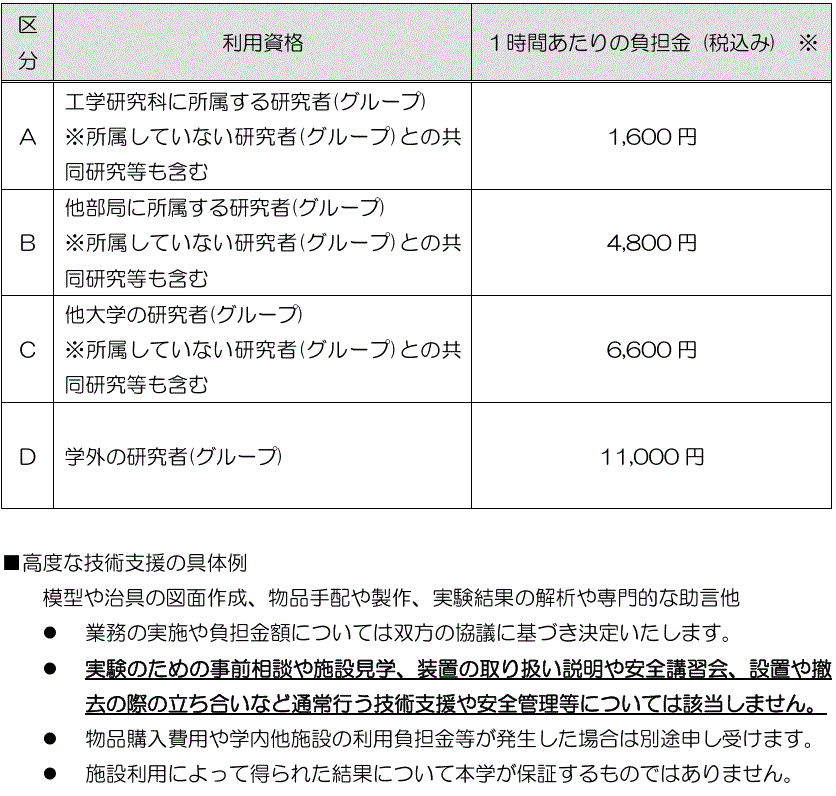 風洞施設の利用に付帯し、本学教職員が高度な技術支援を行った場合は、風洞利用負担金とは別に下記に定める業務依頼負担金が必要な場合があります。(2026年4月1日から運用) |